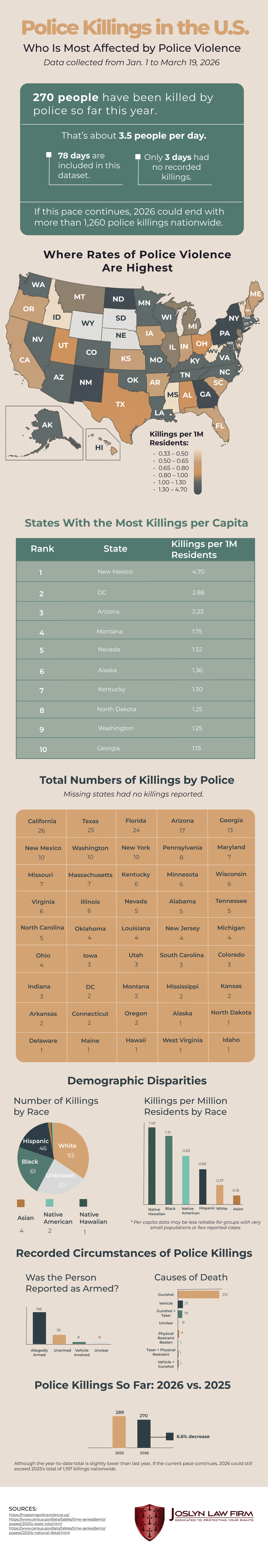 Using data from Mapping Police Violence and population estimates from the U.S. Census Bureau, the Joslyn Law Firm team put together an examination of police killings recorded between Jan. 1 and March 19, 2026, in order to get a clearer picture of who’s been affected by police violence the most.